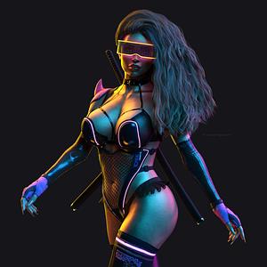Digital artwork-render in 4K of a Cyber Neon Girl 3D avatar made manually in professional 3D modeling programs.