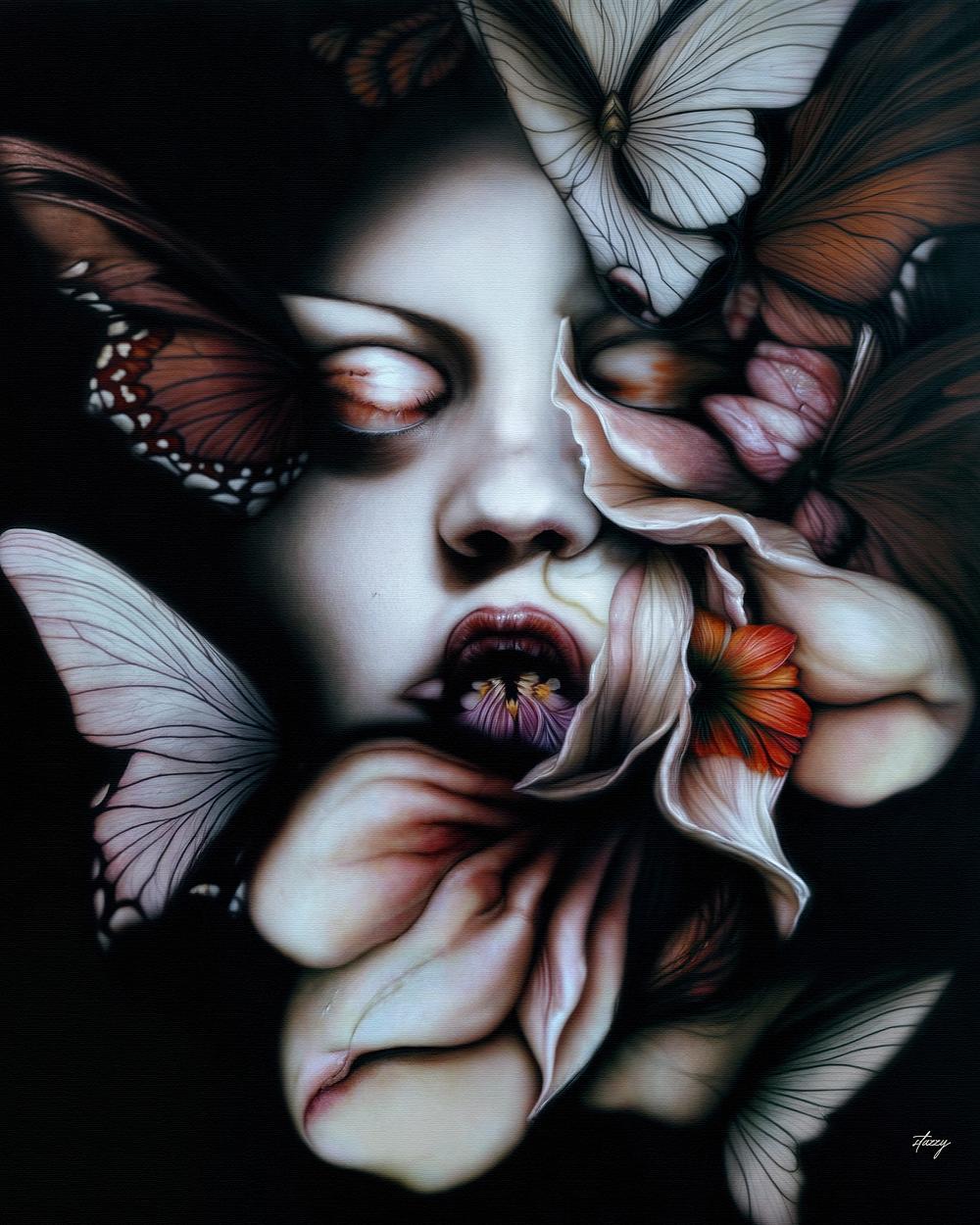 "Distorted Point of View" captures the unsettling blend of beauty and eeriness through the fusion of a human face with flowers and butterflies. The surreal artwork, painted with acrylic on fine art paper, portrays the face emerging from the floral arrangement, symbolising the distorted perceptions we often have of reality. The butterflies add a sense of fleeting beauty amidst the disquieting imagery. Original art created with acrylic on canvas, "Distorted Point of View" explores the theme of how our perspectives can be both enchanting and deceptive, inviting viewers to question the nature of their own perceptions and the hidden truths within.