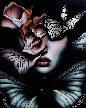 "SHADOW SELF" captures the haunting interplay between the human psyche and nature. This evocative artwork features a ghostly human face intertwined with flowers and butterflies, symbolizing the dance between beauty and the shadow self. The surreal composition, with its dramatic contrasts, invites viewers to explore the mysterious balance between light and darkness. The face emerging from the blossoms and butterflies hints at how our innermost fears and desires are intimately connected, urging contemplation of the hidden depths within us.