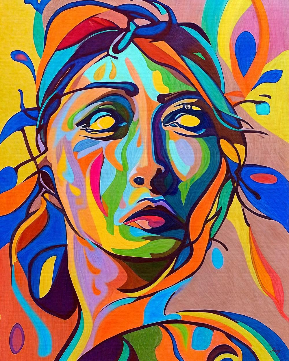 Print of an artwork - original painted with acrylic on canvas. "FACELESS COLOR" is a captivating set of 6 artworks that immerse viewers in a psychedelic and surreal experience. The pieces feature a mesmerizing blend of vibrant colors and abstract shapes, with a human face emerging from the chaotic harmony. The swirling patterns and intense hues create a dreamlike atmosphere, reflecting the complexity and depth of the modern human psyche. This artwork is part of the "New Age Psyche" collection, which explores the modern mind's journey through altered states of consciousness and the intersection of reality and fantasy.